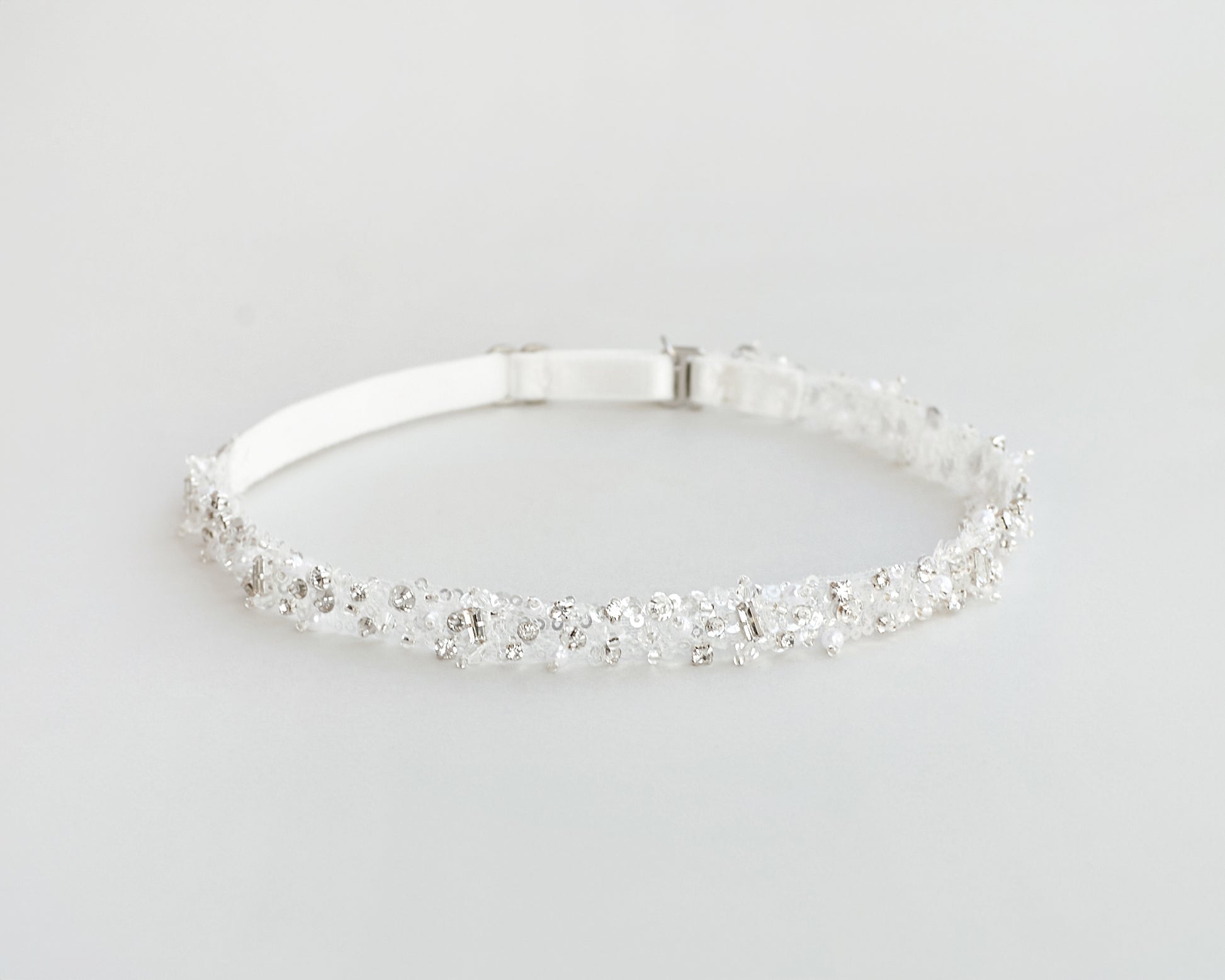 A silver garter intricately embroidered with sparkling gemstones, pearls, beads, and sequins. This 1 cm (0.4 inch) piece is both opulent and elegant.