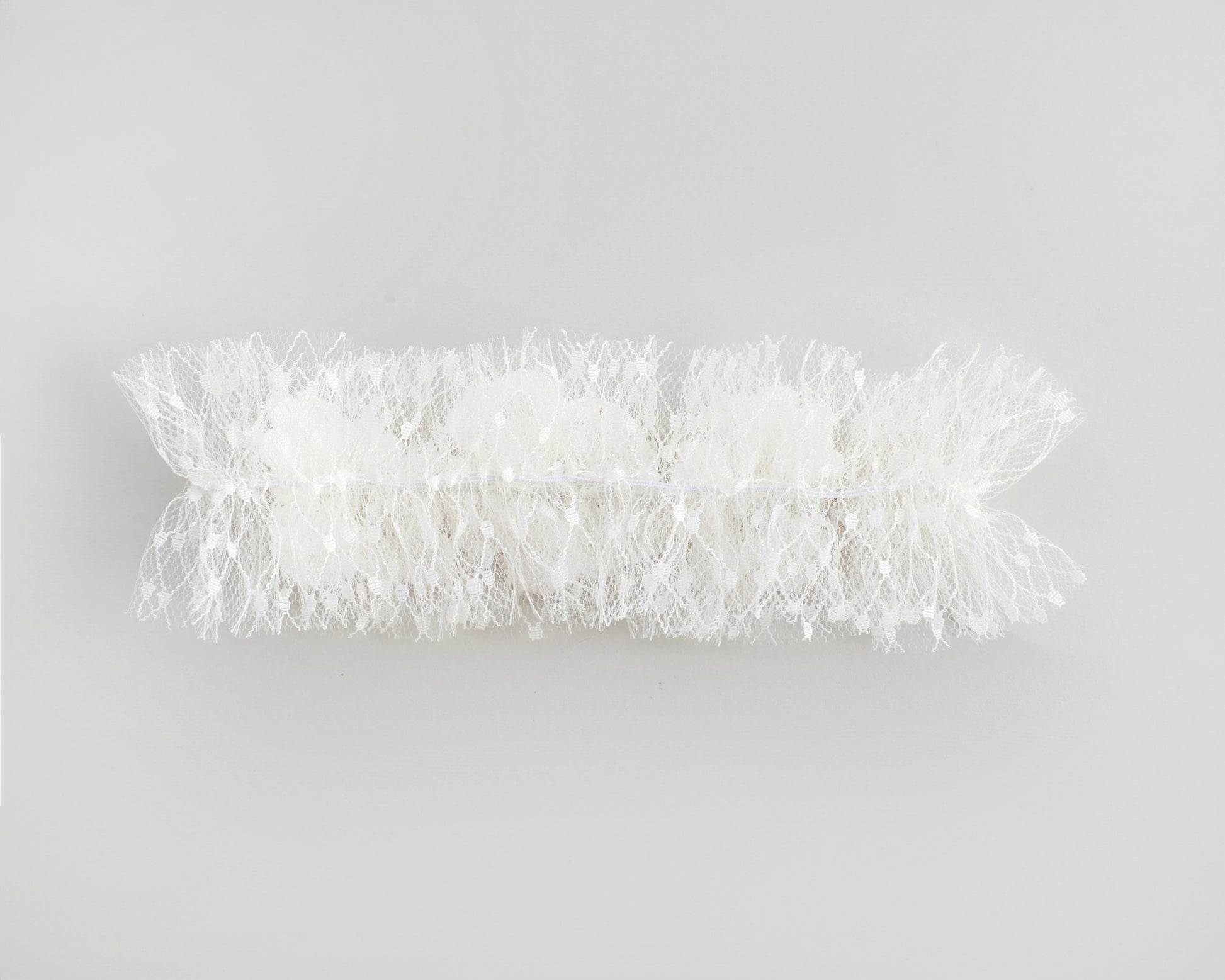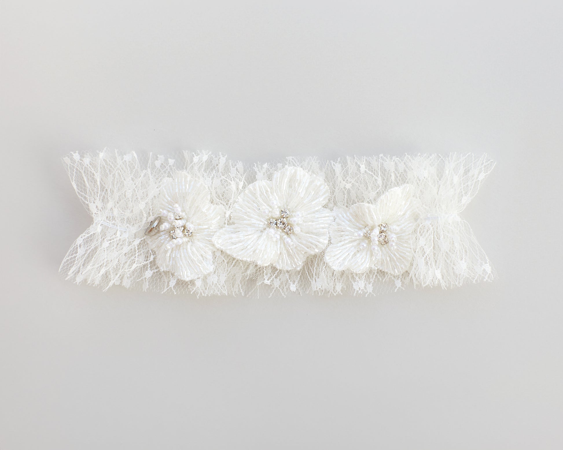The cream garter is sewn with a soft tulle in a polka dot pattern. It is adorned with 3 large flowers made of sparkling beads and gems in the center. It is sewn in a single layer and attached to a very thin elastic thread. The width of the garter is approximately 5.5 cm (2 inches)