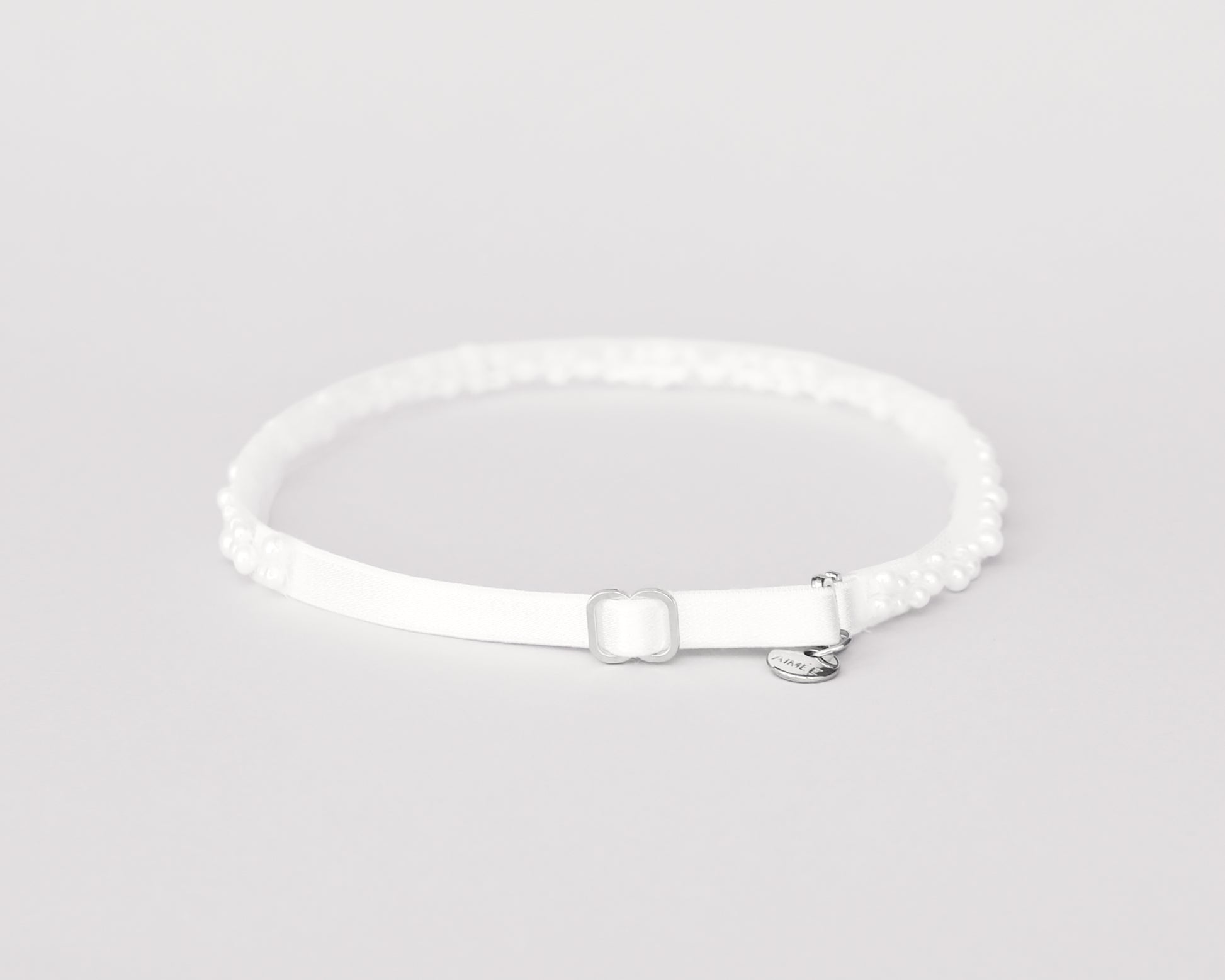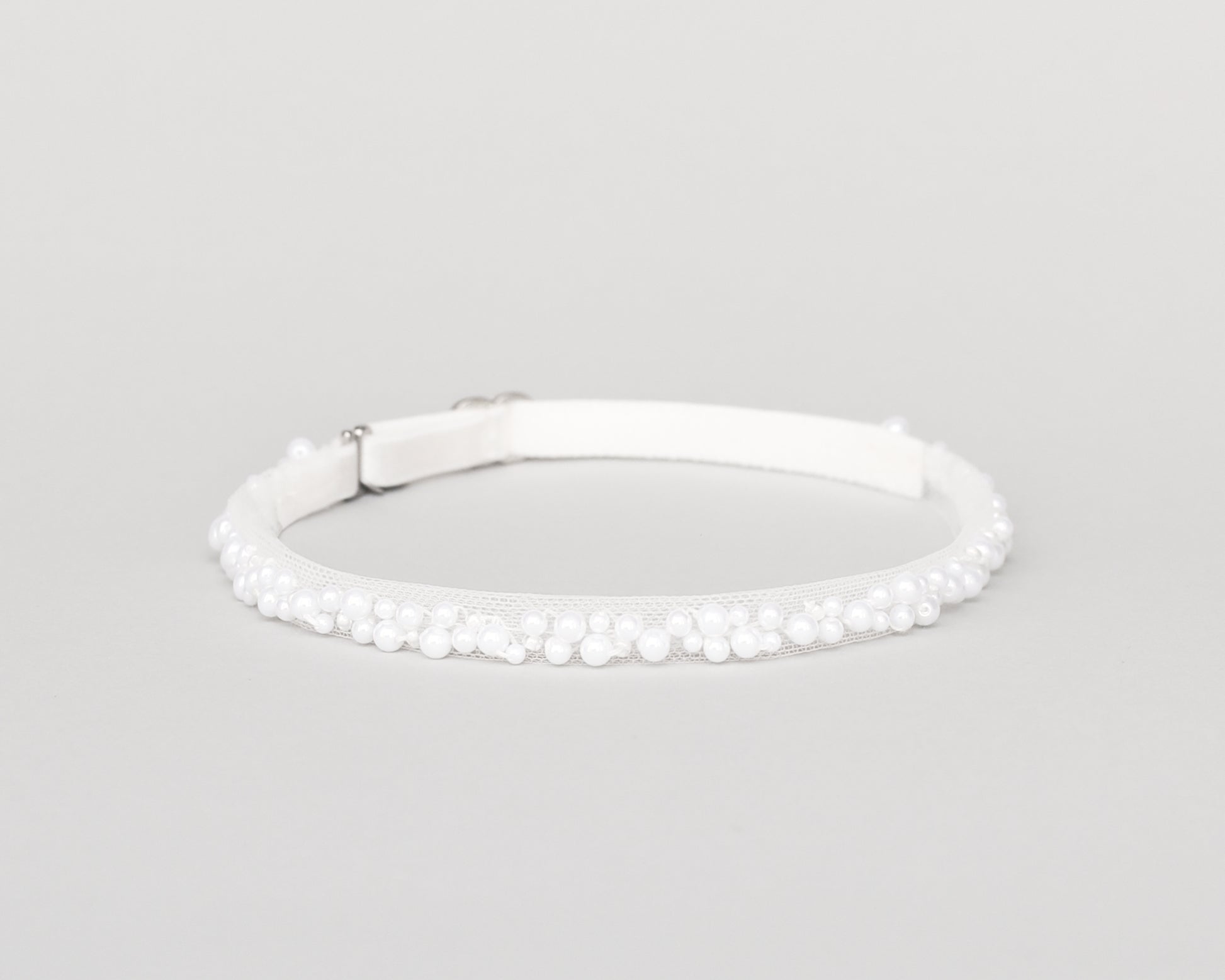 A garter intricately embellished all around with ivory pearls sewn into an elastic band, it features an adjustor in the back, allowing for size variations. The garter measures approximately 1 cm (0.4 inch) in width, showcasing delicate craftsmanship.