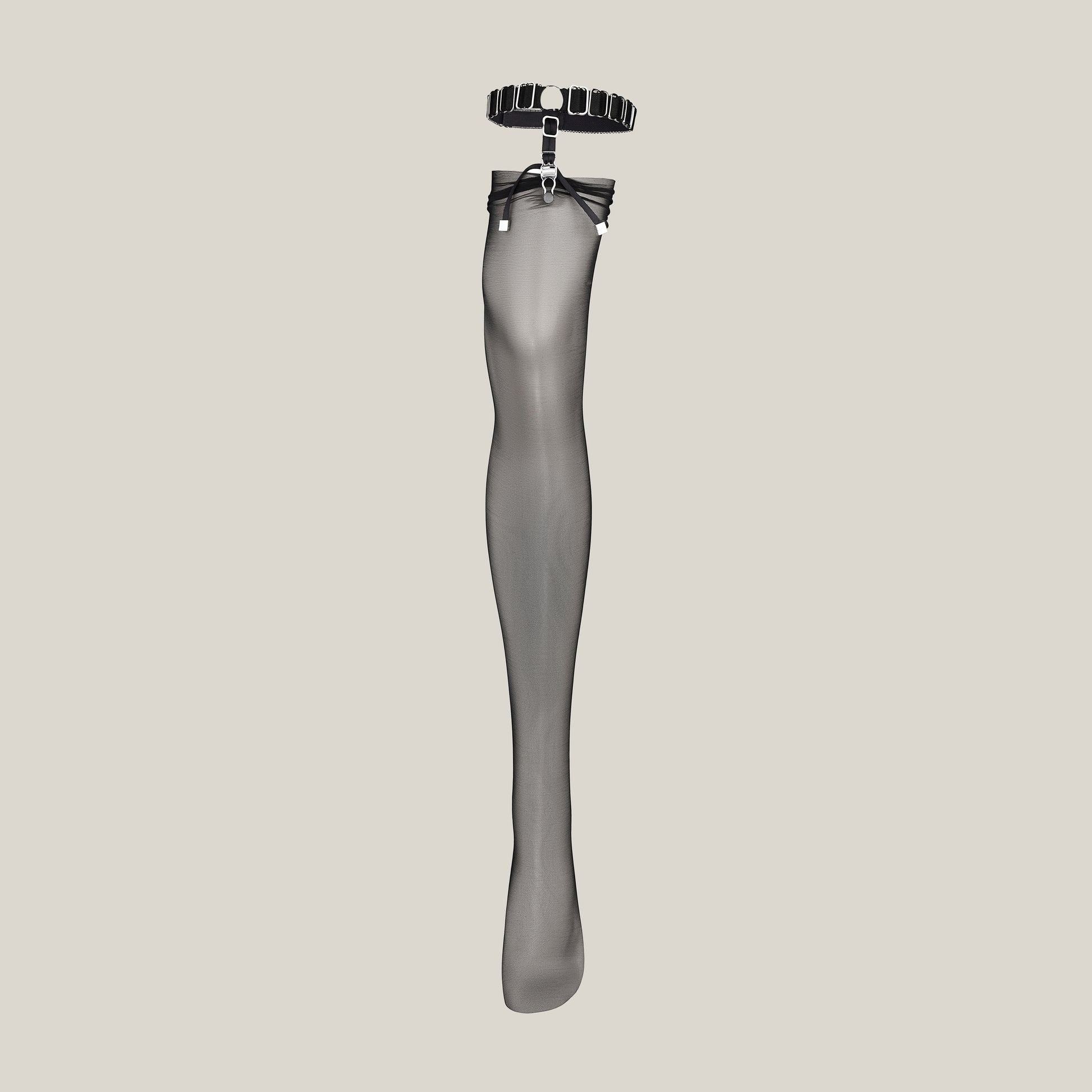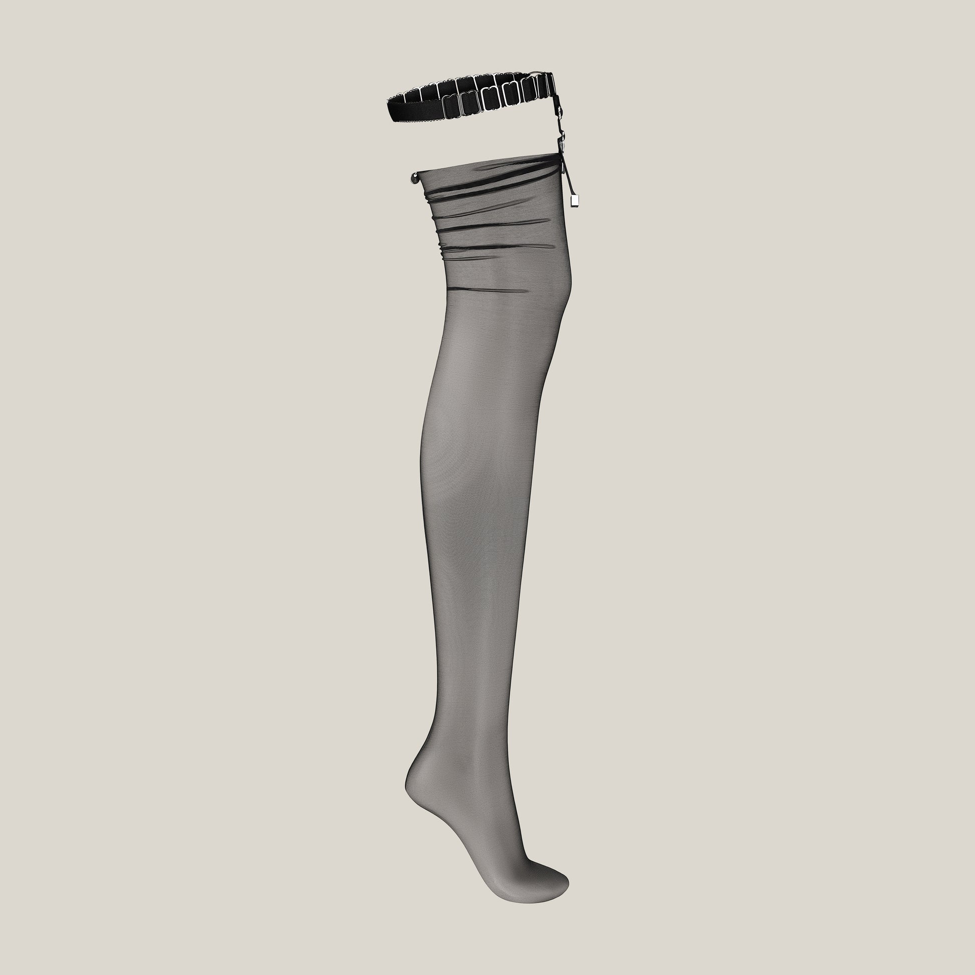 These minimalist fishnet stockings are crafted from soft black mesh with a raw-cut finish at the top for a sleek, natural fit. A delicate seam runs from the heel to the upper thigh, visually adding length to the legs and a touch of retro elegance. Complete your ensemble by pairing them with our adjustable garters (sold separately) to create a more personalized and unique look.