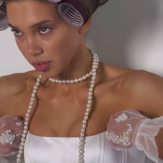 Pearl — short ivory mesh gloves featuring a delicate ruffle at the wrist that ties into a bow. The top of the glove is adorned with transparent beads and pearls for a romantic, timeless elegance.