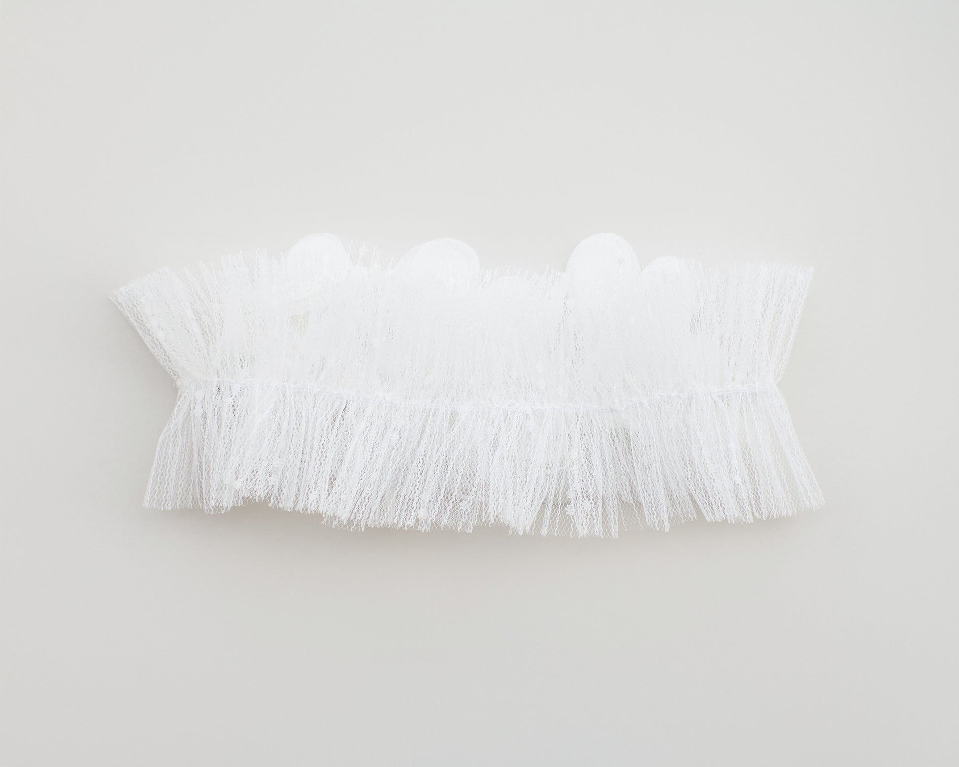 A white mesh garter sewn in a single layer using thin elastic thread. The mesh has a striped pattern with small polka dots. In the center, there are two to three, flower-shaped decorations resembling poppies, adorned with beads. The width of the garter is approximately 5 cm (2 inches)