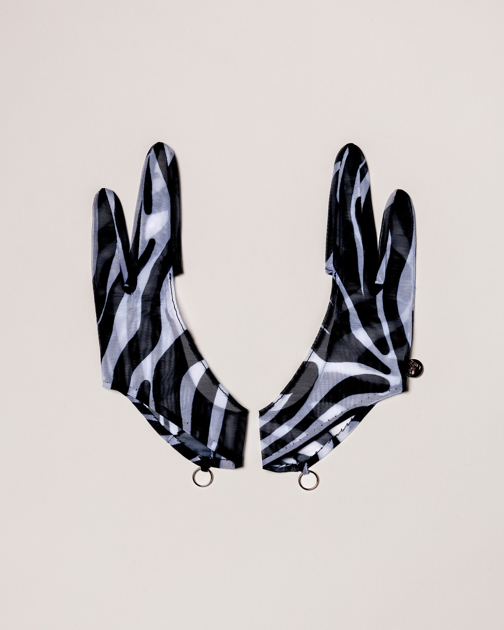 Rebel: these two-finger gloves are bold zebra print on sheer mesh with subtle metal detailing. Fierce and fashion-forward — for those who want to leave an impression.
