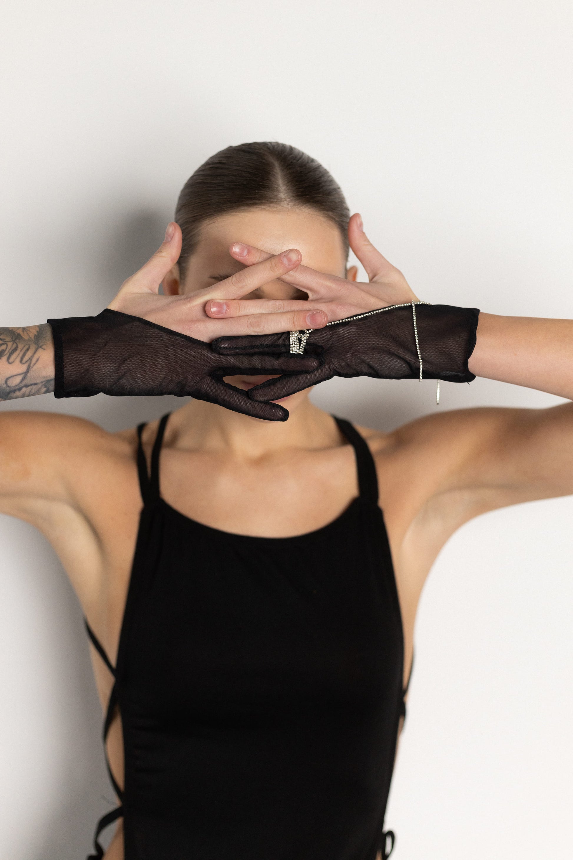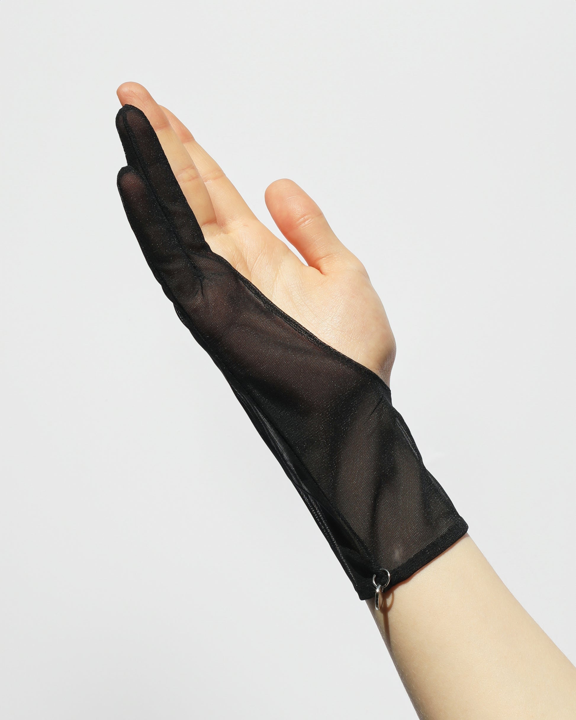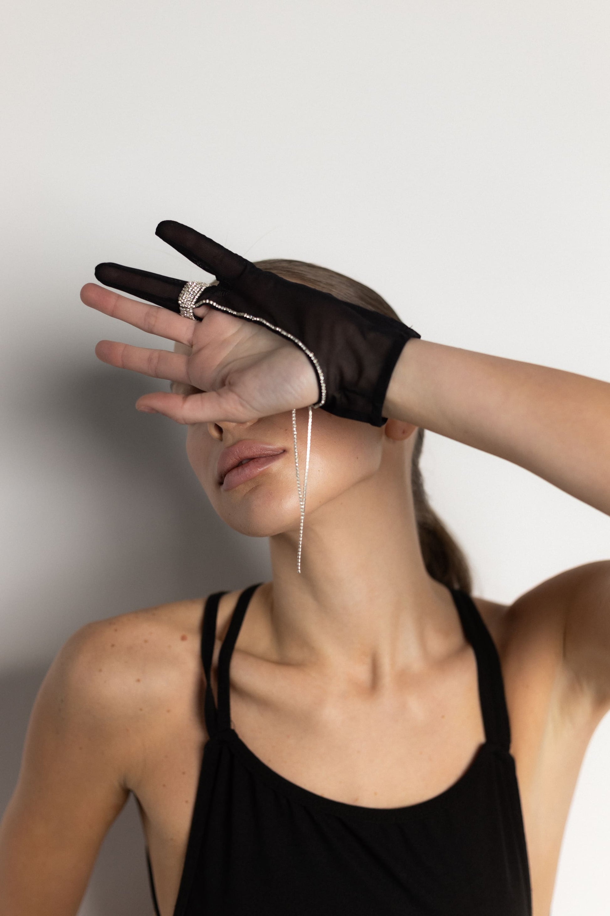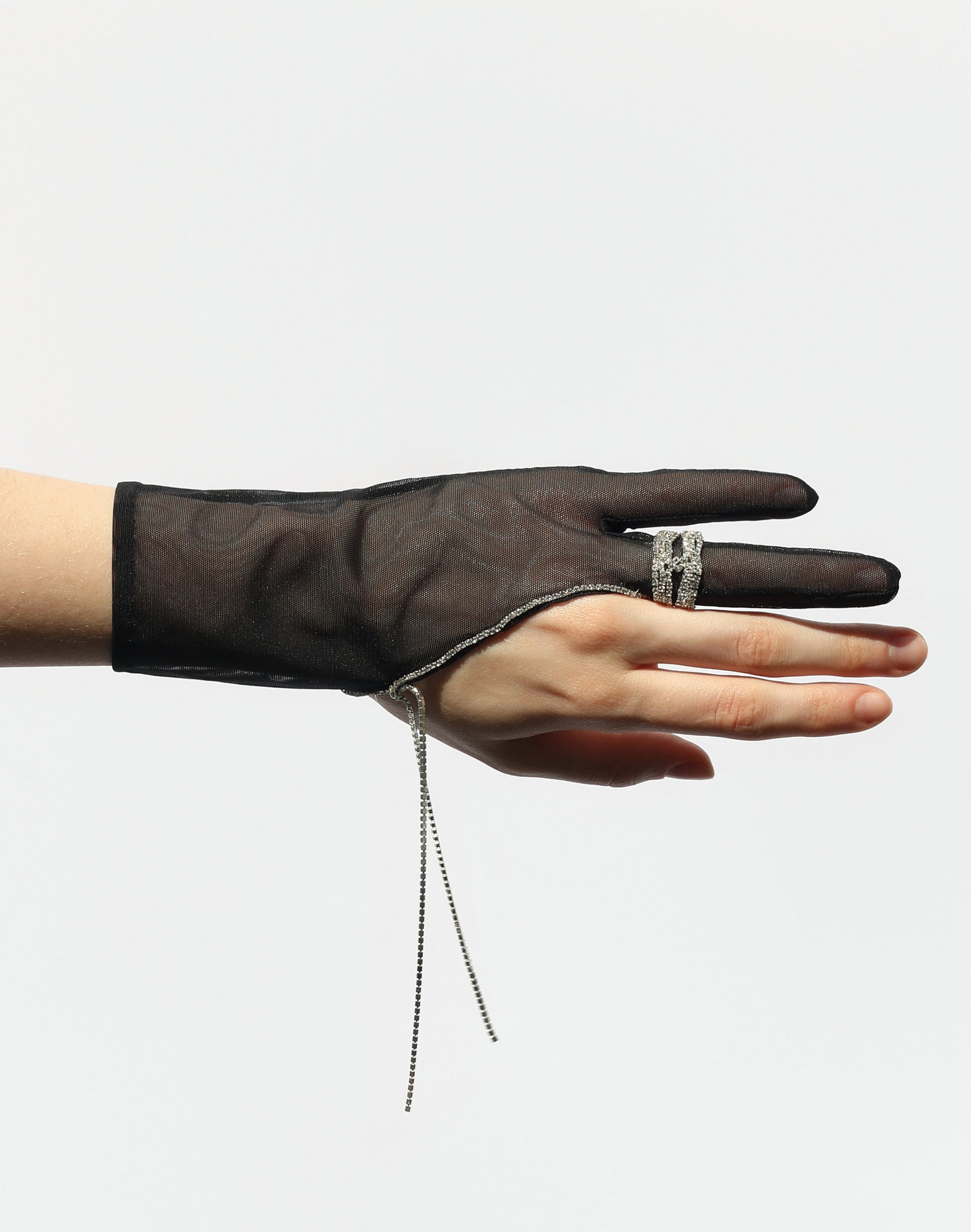 Stunning Black: crisp black, mesh, two-finger gloves are accented on the left with a sparkling ring and delicate chains. Elegant yet bold — a standout piece for refined occasions.