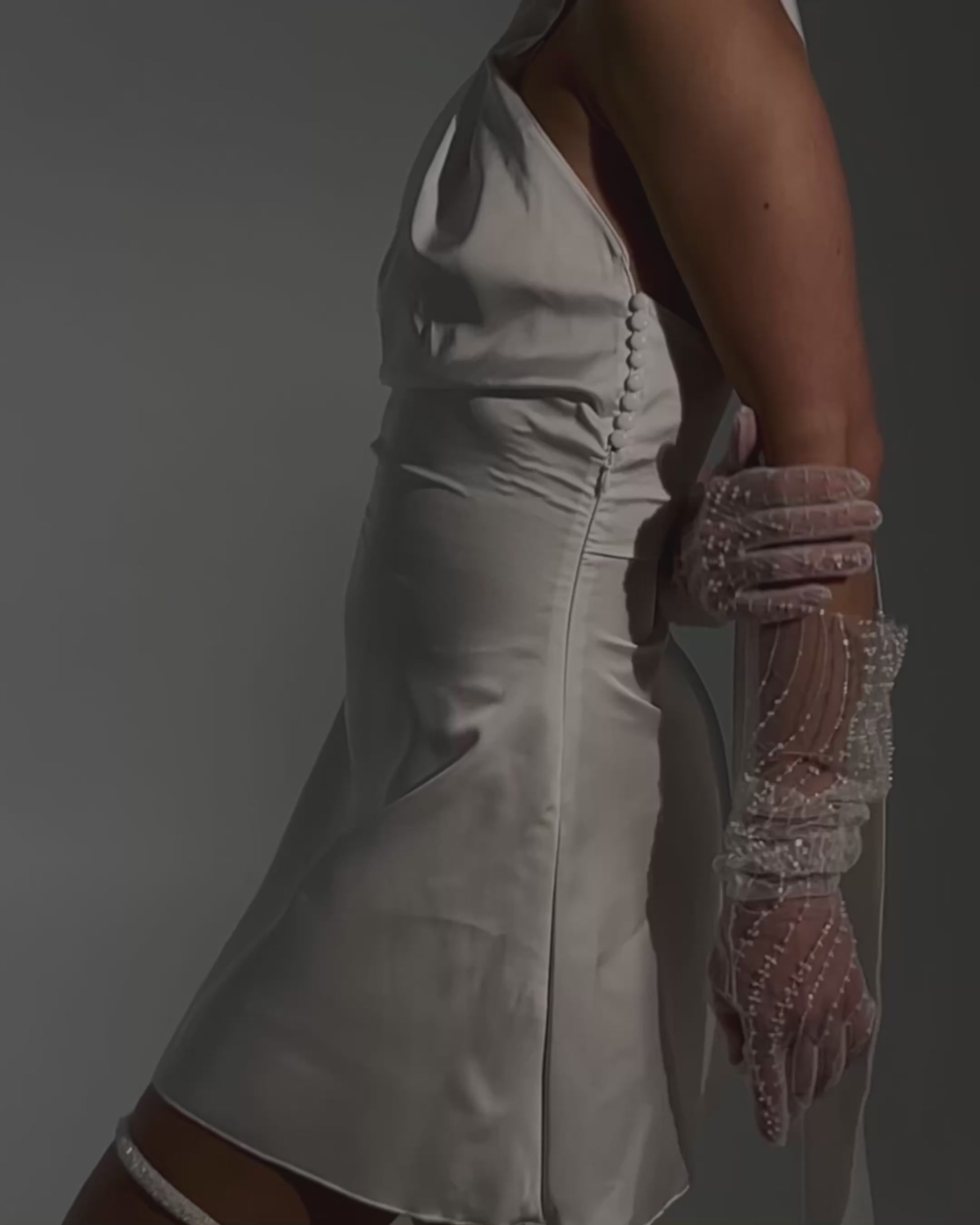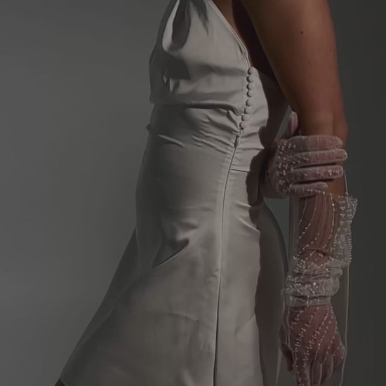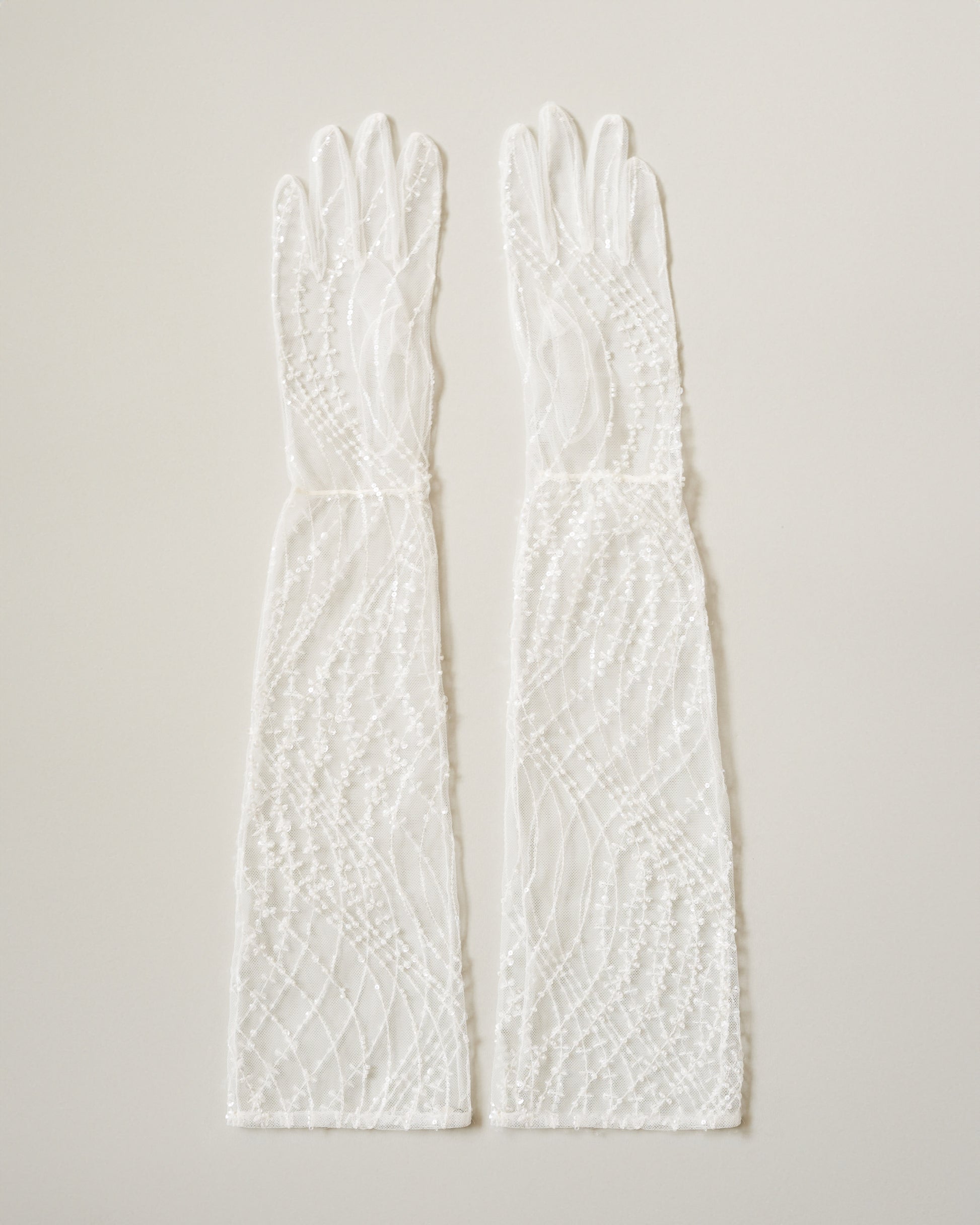 Elegant ivory bridal gloves, handmade for the modern bride. The perfect finishing touch to your wedding look. Lightweight mesh and wave-shaped embroidery are accented with subtle beading. A romantic blend of texture and luster.