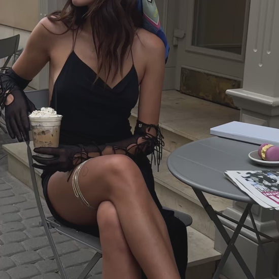 This silver garter is completely embroidered with tiny gemstones. The back has a 1 cm transparent elastic band and an adjustor. It consists of 4 chains with sparkle gems.